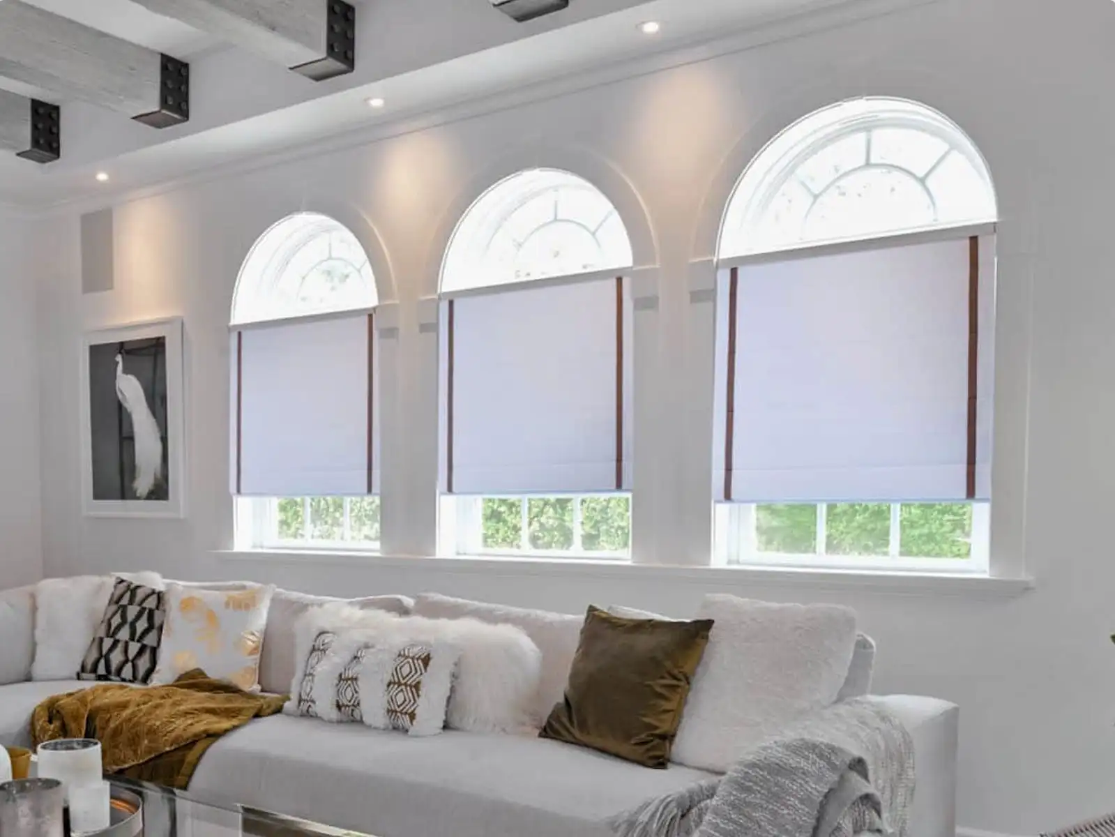 Curtains are one of the most flexible and elegant options for arched windows. With custom curved tracks or ceiling-mounted systems, they can be shaped to follow the contour of the arch or installed below it for a classic layered look.