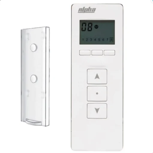 The Alpha WSRE303-8C Remote is an 8-channel Navigator controller designed to operate Alpha motorised blinds, shutters, and awnings. It can control up to eight motors individually or in grouped configurations.